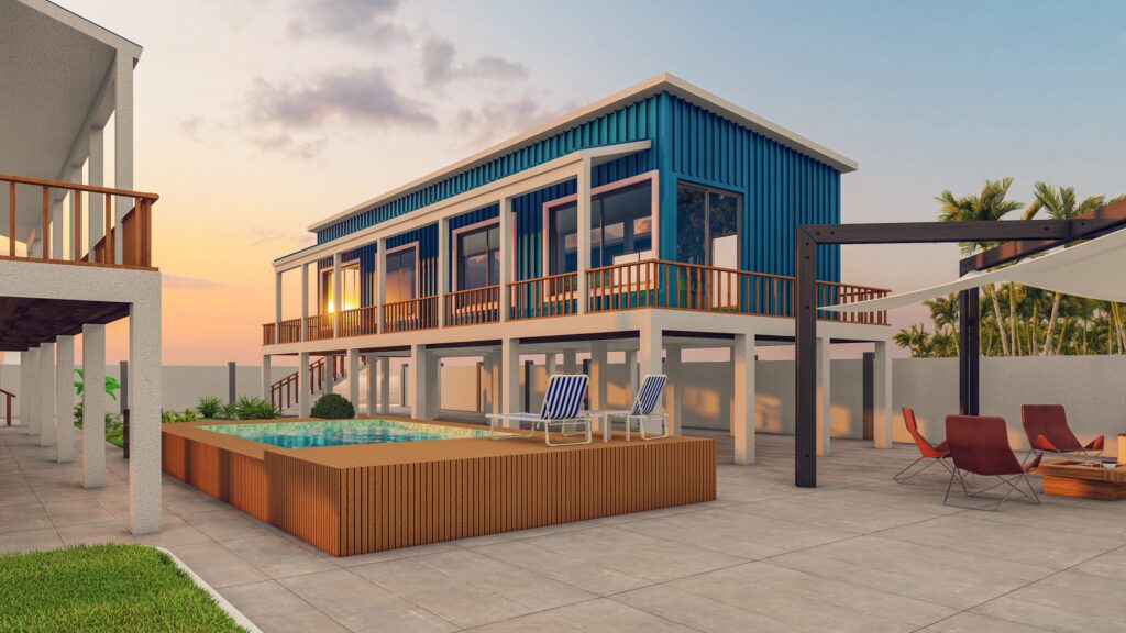 A contemporary beach house built from repurposed containers, merging sustainable architecture with relaxed coastal living.